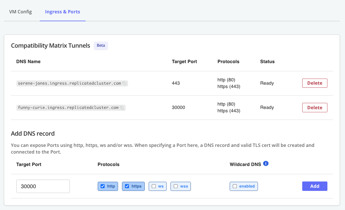• If you created the VM with Compatibility Matrix, enter the URL that you copied for the DNS record with a target port of 443. For example, pensive-keldysh.ingress.replicatedcluster.com.